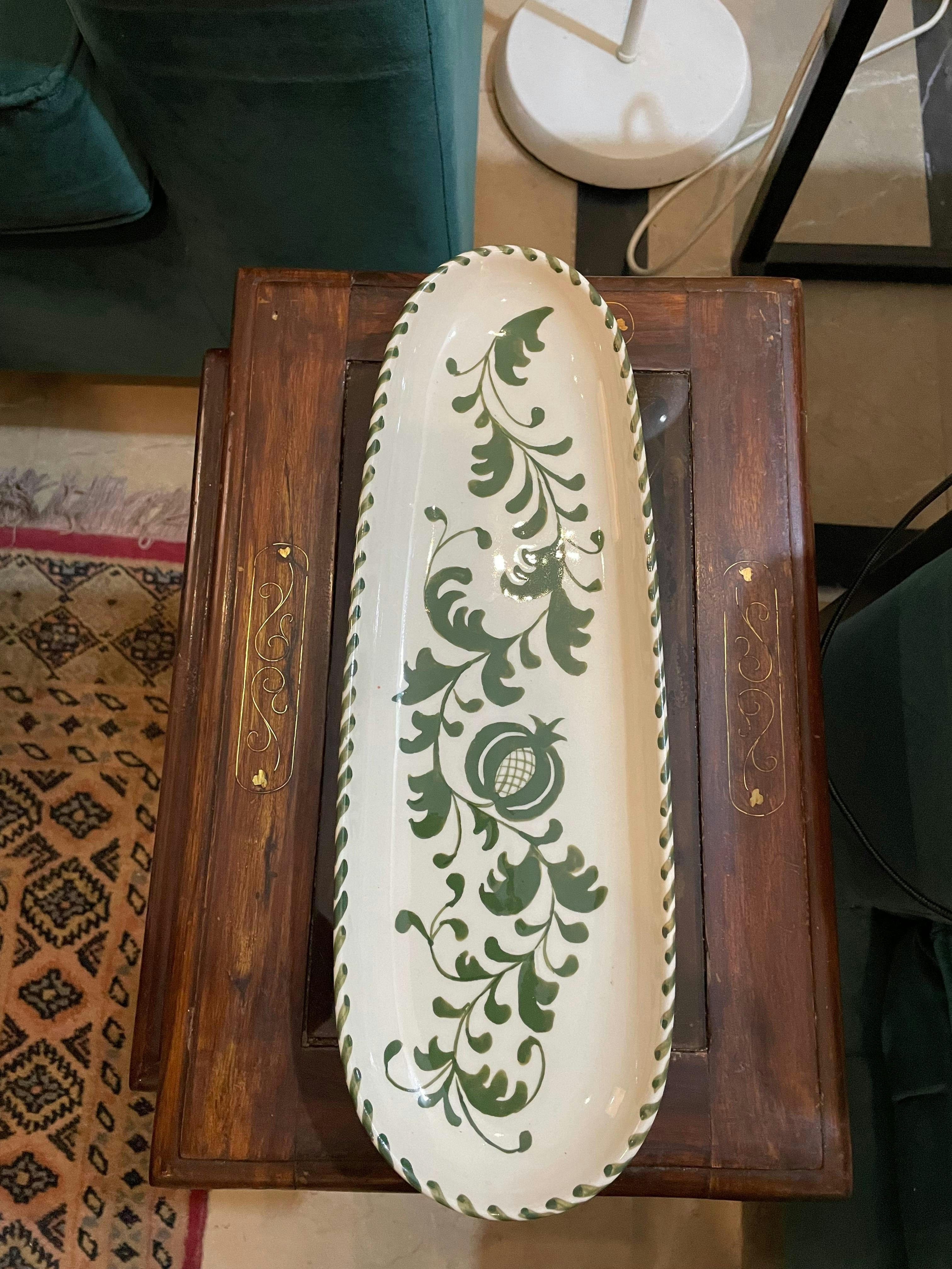 The Olive Bloom Platter is a graceful handmade ceramic piece, featuring a delicate vine motif in rich green against a smooth ivory base. Its elongated form makes it ideal for serving breads, appetizers, or displaying as a decorative centerpiece. Accented with a hand-painted leafy border, this platter blends traditional artistry with timeless charm, bringing a touch of nature-inspired elegance to your table and décor.