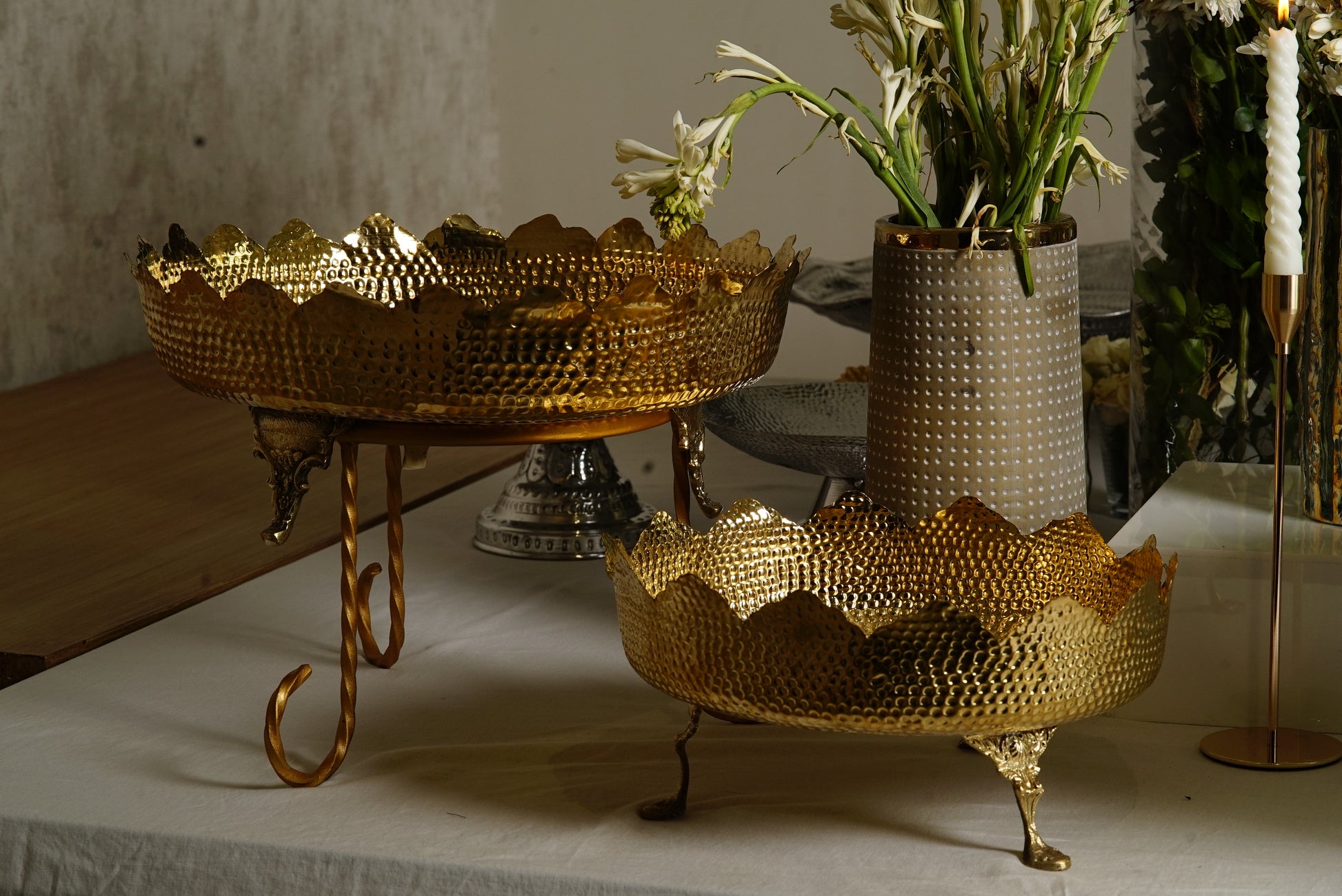 Description: The Brass Thaal is a stunning piece of brass finish tableware that combines functionality with aesthetic appeal. Hand-crafted with minimal machine work, each piece has a unique and authentic finish. This versatile Thaal can be used for serving food or as an elegant display for flowers and decorative items. Available in two sizes, it suits a variety of home settings.